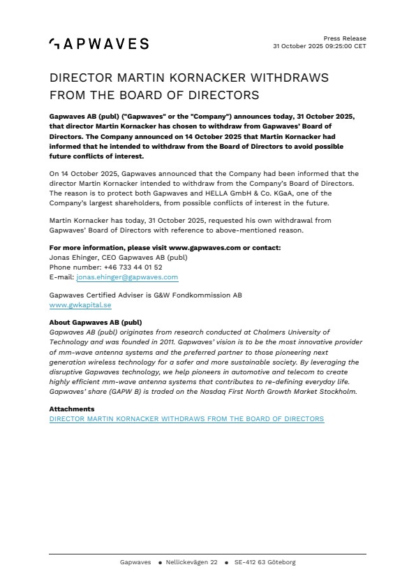 Gapwaves AB (publ) ("Gapwaves" or the "Company") announces today, 31 October 2025, that director Martin Kornacker has chosen to withdraw from Gapwaves’ Board of Directors. The Company announced on 14 October 2025 that Martin Kornacker had informed that he intended to withdraw from the Board of Directors to avoid possible future conflicts of interest.