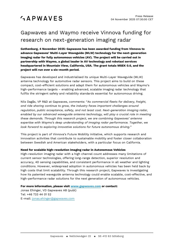 Gothenburg, 4 November 2025: Gapwaves has been awarded funding from Vinnova to advance Gapwaves’ Multi-Layer Waveguide (MLW) technology for the next-generation imaging radar for fully autonomous vehicles (AV). The project will be carried out in partnership with Waymo, a global leader in AV technology and robotaxi services headquartered in Mountain View, California, USA. The grant totals MSEK 0.6, and the project will run over a six-month period.