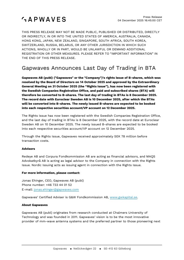 Gapwaves AB (publ) ("Gapwaves" or the "Company")’s rights issue of B-shares, which was resolved by the Board of Directors on 14 October 2025 and approved by the Extraordinary General Meeting on 31 October 2025 (the “Rights Issue”), has now been registered with the Swedish Companies Registration Office, and paid and subscribed shares (BTA) will therefore be converted to B-shares. The last day of trading in BTAs is 8 December 2025. The record date with Euroclear Sweden AB is 10 December 2025, after which the BTAs will be converted into B-shares. The newly issued B-shares are expected to be booked into each respective securities account/VP account on 12 December 2025.
