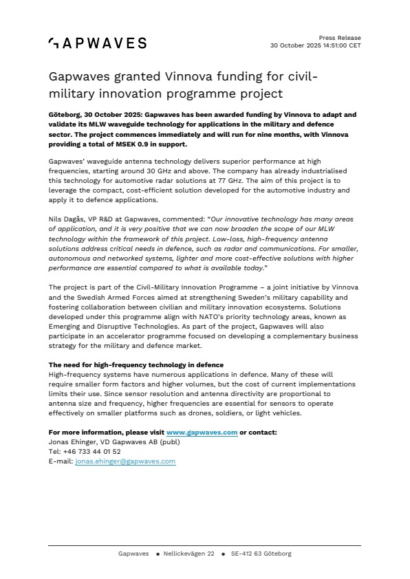 Göteborg, 30 October 2025: Gapwaves has been awarded funding by Vinnova to adapt and validate its MLW waveguide technology for applications in the military and defence sector. The project commences immediately and will run for nine months, with Vinnova providing a total of MSEK 0.9 in support.