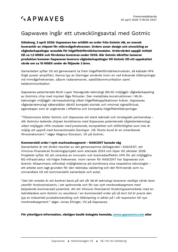 Göteborg, 2 april 2026: Gapwaves har erhållit en order från Gotmic AB, en svensk leverantör av chipset för mikrovågsfrekvenser. Ordern avser design och utveckling av vågledarkapslingar avsedda för högeffektförstärkarmoduler. Ordervärdet uppgår initialt till ca 1,5 MSEK och förväntas levereras under 2026. När Gotmic därefter lanserar produkten kommer Gapwaves leverera vågledarkapslingar till Gotmic till ett uppskattat värde om ca 10 MSEK under de följande 3 åren.