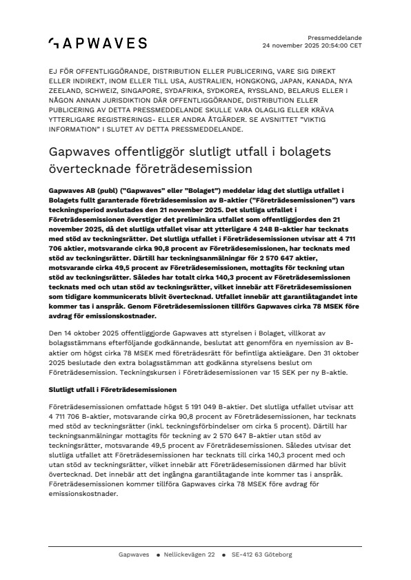 Gapwaves AB (publ) (”Gapwaves” eller ”Bolaget”) meddelar idag det slutliga utfallet i Bolagets fullt garanterade företrädesemission av B-aktier (”Företrädesemissionen”) vars teckningsperiod avslutades den 21 november 2025. Det slutliga utfallet i Företrädesemissionen överstiger det preliminära utfallet som offentliggjordes den 21 november 2025, då det slutliga utfallet visar att ytterligare 4 248 B-aktier har tecknats med stöd av teckningsrätter. Det slutliga utfallet i Företrädesemissionen utvisar att 4 711 706 aktier, motsvarande cirka 90,8 procent av Företrädesemissionen, har tecknats med stöd av teckningsrätter. Därtill har teckningsanmälningar för 2 570 647 aktier, motsvarande cirka 49,5 procent av Företrädesemissionen, mottagits för teckning utan stöd av teckningsrätter. Således har totalt cirka 140,3 procent av Företrädesemissionen tecknats med och utan stöd av teckningsrätter, vilket innebär att Företrädesemissionen som tidigare kommunicerats blivit övertecknad. Utfallet innebär att garantiåtagandet inte kommer tas i anspråk. Genom Företrädesemissionen tillförs Gapwaves cirka 78 MSEK före avdrag för emissionskostnader.