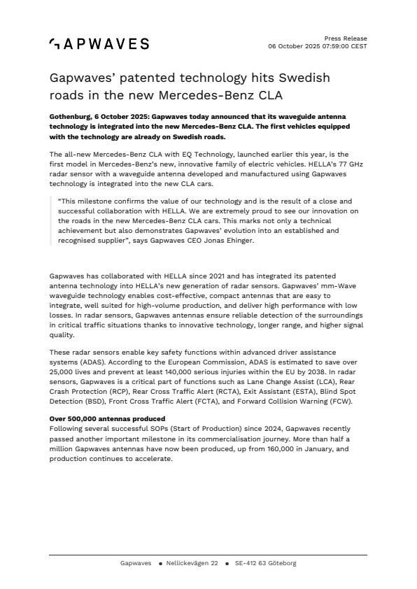 “This milestone confirms the value of our technology and is the result of a close and successful collaboration with HELLA. We are extremely proud to see our innovation on the roads in the new Mercedes-Benz CLA cars. This marks not only a technical achievement but also demonstrates Gapwaves’ evolution into an established and recognised supplier”, says Gapwaves CEO Jonas Ehinger.