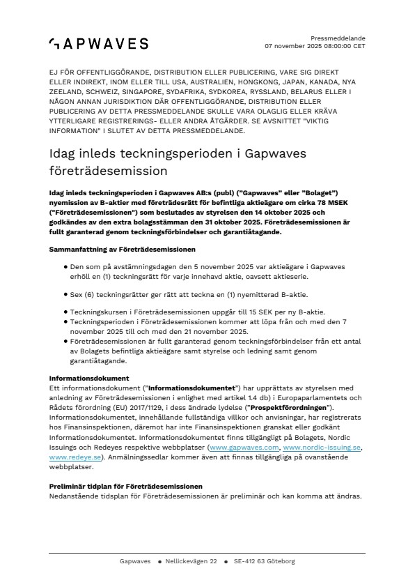 Idag inleds teckningsperioden i Gapwaves AB:s (publ) (”Gapwaves” eller ”Bolaget”) nyemission av B-aktier med företrädesrätt för befintliga aktieägare om cirka 78 MSEK ("Företrädesemissionen") som beslutades av styrelsen den 14 oktober 2025 och godkändes av den extra bolagsstämman den 31 oktober 2025. Företrädesemissionen är fullt garanterad genom teckningsförbindelser och garantiåtagande.