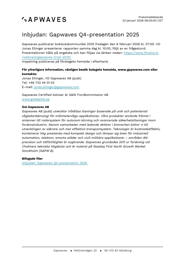Gapwaves publicerar bokslutskommuniké 2025 fredagen den 6 februari 2026 kl. 07:00. VD Jonas Ehinger presenterar rapporten samma dag kl. 10:00, följt av en frågestund. Presentationen hålls på engelska och kan följas via länken nedan: https://www.finwire.tv/webcast/gapwaves-2/q4-2025/