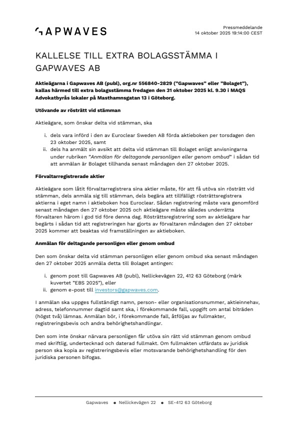 Aktieägarna i Gapwaves AB (publ), org.nr 556840-2829 (”Gapwaves” eller ”Bolaget”), kallas härmed till extra bolagsstämma fredagen den 31 oktober 2025 kl. 9.30 i MAQS Advokatbyrås lokaler på Masthamnsgatan 13 i Göteborg.
