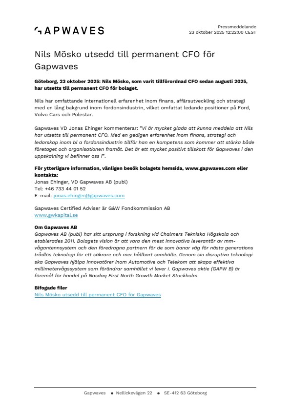Gapwaves VD Jonas Ehinger kommenterar: ”Vi är mycket glada att kunna meddela att Nils har utsetts till permanent CFO. Med en gedigen erfarenhet inom finans, strategi och ledarskap inom bl a fordonsindustrin tillför han en kompetens som kommer att stärka både företaget och organisationen framåt. Det är ett mycket positivt tillskott för Gapwaves i den uppskalning vi befinner oss i”.