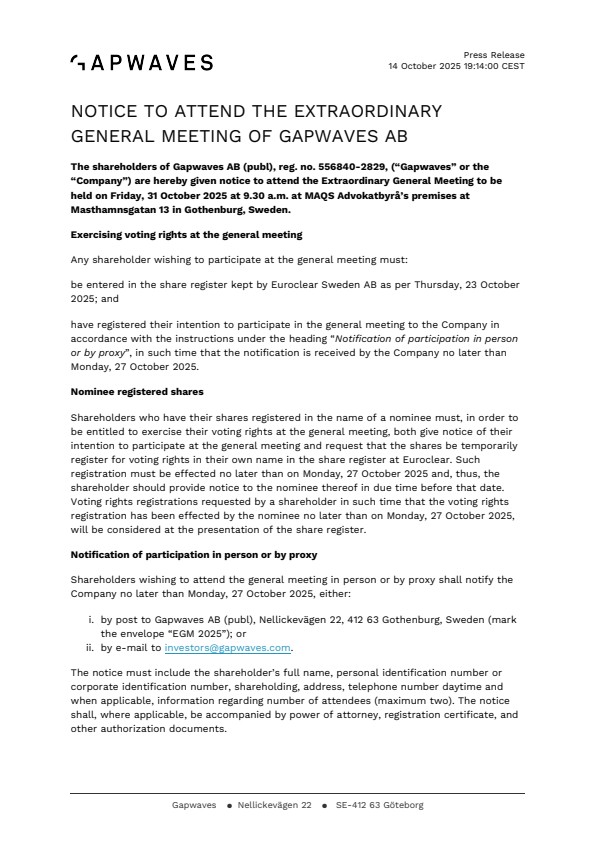 The shareholders of Gapwaves AB (publ), reg. no. 556840-2829, (“Gapwaves” or the “Company”) are hereby given notice to attend the Extraordinary General Meeting to be held on Friday, 31 October 2025 at 9.30 a.m. at MAQS Advokatbyrå’s premises at Masthamnsgatan 13 in Gothenburg, Sweden.