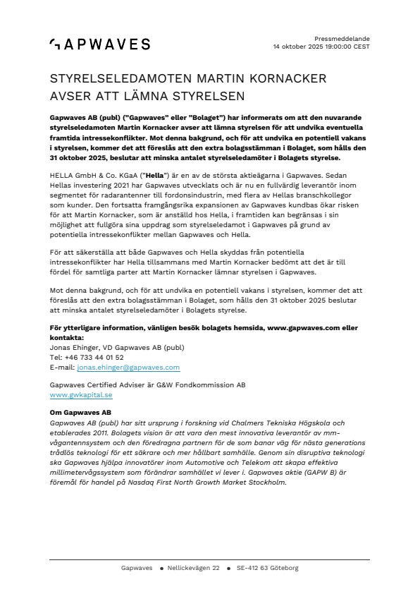 Gapwaves AB (publ) (”Gapwaves” eller ”Bolaget”) har informerats om att den nuvarande styrelseledamoten Martin Kornacker avser att lämna styrelsen för att undvika eventuella framtida intressekonflikter. Mot denna bakgrund, och för att undvika en potentiell vakans i styrelsen, kommer det att föreslås att den extra bolagsstämman i Bolaget, som hålls den 31 oktober 2025, beslutar att minska antalet styrelseledamöter i Bolagets styrelse.